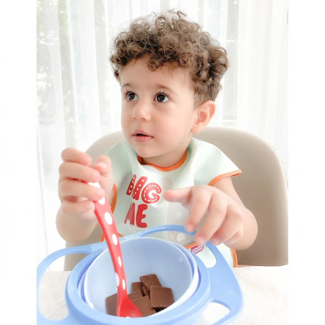 Die babyjem Wunderschale fällt aufgrund ihrer kräftigen Farben mindestens ebenso ins Auge wie dank ihres ungewöhnlichen Designs. Die wahre Überraschung – eine Schale mit Schwenkmechanismus – verbirgt sich jedoch im Inneren der Konstruktion. Die Wunderschale von babyjem macht ihrem Namen alle Ehre. Die an ein Küchensieb mit geschwungenem Aufsatz erinnernde Konstruktion beherbergt in ihrem Inneren eine leuchtend gelbe Schale. Diese Innenschale besitzt ein 360-Grad-Schwenkdesign. Mit anderen Worten: Egal wie man die Außenschale dreht – die Innenschale bleibt an ihrem Platz. Babybrei, Obststückchen und Co. können damit nicht kleckern oder herausfallen. Auch die Außenschale erleichtert Babys das selbstständige Essen. Die robuste Schüssel besitzt vier kurze Standbeine für kippelfreien Stand auch auf unebenem Untergrund. Ergonomisch geschwungen, erleichtert die rundumlaufende Halterung das Greifen und Festhalten. Ein fest schließender Deckel macht aus der Essschale eine kühlschranktaugliche Aufbewahrungsdose. Die Wunderschale mit ihrem leuchtend gelben Kern lenkt Babys Aufmerksamkeit auf natürliche Weise auf das Essen. Das langlebige, von babyjem auf Produktsicherheit getestete, Material ist spülmaschinenfest und einfach zu reinigen.