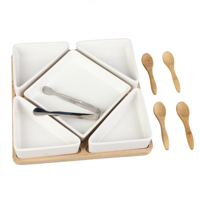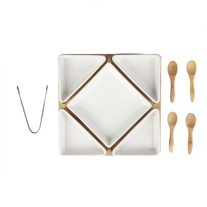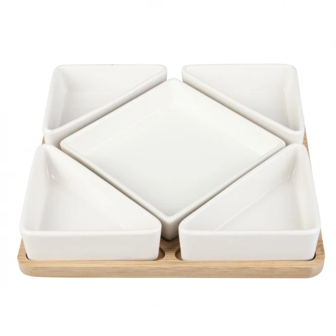 Bambusbrett – mit 5 weißen Keramikschalen