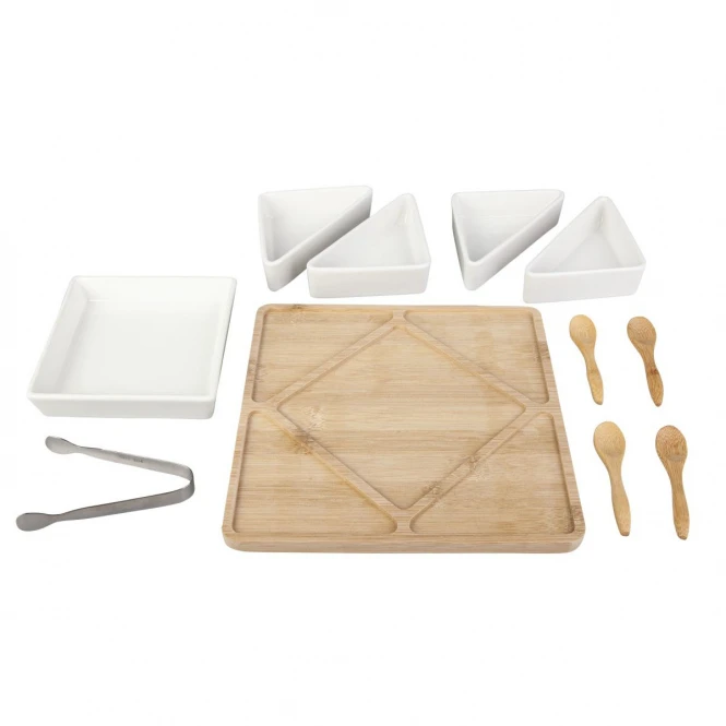 - Bambusbrett, 5 Schälchen, 1 Zange, 4 Löffel
